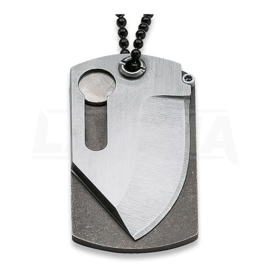 John Kubasek is already known to many as the designer of the successful Credit Card Knife. John Kubasek has now taken the “Backup Knife” topic one step further and presents the 24 gram light-weight Dog Tag Knife. Like its namesake, it is carried around the neck on a ball chain and boasts a thickness of less than 4 mm when retracted (measured without blade pivot point). The chisel grind (single-sided blade grind) provides maximum carrying and operating safety by contacting the titanium liner as closely as possible with the flat backside of the edge. A clever magnetic mechanism also secures the blade in the retracted and deployed state; in each case, the action is strictly accomplished with magnetic force, but with a true locking mechanism instead. As a result, accidental deployment is eliminated even when engaged in active/dynamic activities. The back side of the titanium liner is ideally suited for laser engraving of the name, nickname, medical data, etc. Shipped with ball chain and carabiner.