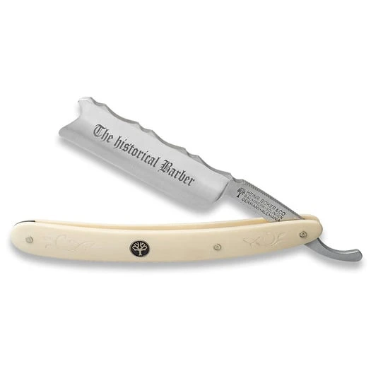 Wanted! – The Boker The Historical Barber is all about saloons, cowboys and smoking guns. Named after the cult barber in the western town of Pullmann City in the Harz Mountains, the razor, strictly limited to 99 pieces, incorporates essential elements of historical Boker razors from the pioneering American era of the Wild West and transfers them to the present day. The satin-finished 6/8 inch blade made of carbon steel is extra-high ground and is beautifully adorned by the eponymous lettering. The avant-garde interpretation of the Barber’s Notch literally gives the knife its spurs and decorates the Boker The Historical Barber as the only true Western hero. As elegant as they are functional, ground hollows line the back of the blade, which are tastefully supplied with the jimpings on both sides of the blade. According to historical models, the hilt is made of artificial ivory and receives its optical refinement through the engraved art nouveau ornaments, three studs made of nickel silver as well as the black Boker tree sign. Supplied with an authentic Boker stamp on the blade, a certificate of authenticity and historical packaging. Handmade in the Boker Knife Manufactory in Solingen.