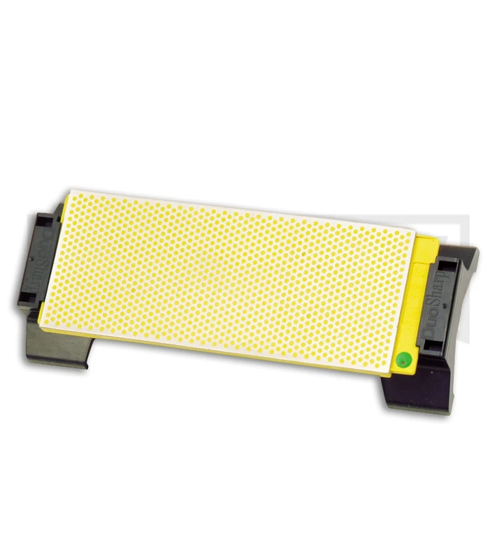 Innovative, multi-patented DuoSharp® Bench Stone is a precision flat, two diamond surfaced sharpener guaranteed to provide consistent, even sharpening every time. The 10″ counter or bench sharpener offers larger, wider diamond surface for sharpening a variety of edges including shears, cleaver and specialty knives, plane sole, machete, etc. Choose from one of the following grit combinations: coarse/extra-coarse, fine/coarse or extra-fine/fine. Sharpening with diamonds is fast and easy. No messy oils neededsharpen dry or with water. Durable construction will provide years of consistent performance and reliable service. For proper tool maintenance, woodworkers, chefs and other professionals rely on the superior quality and versatility of DMT® products. Made in USA.