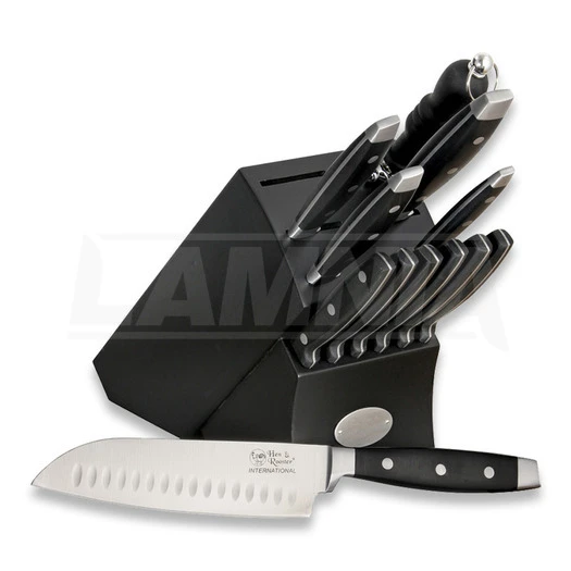 Knives feature stainless blades, full tang, black composition handles and stainless bolster (except for steak knives). Includes one each of 12 3/4″ overall Santoku knife with 6 7/8″ blade, 13 1/2″ slicer with 7 7/8″ blade, 10 5/8″ overall Santoku knife with 5 1/4″ blade, 10 1/8″ overall serrated utility knife with 5″ blade, 7 7/8″ overall paring knife with 3 1/2″ blade, six 9 1/8″ overall steak knives with 4 5/8″ partially serrated blades and a 12 7/8″ overall sharpening steel with 7 7/8″ rod, guard and hanger ring. Also includes a black finish wood block with Hen & Rooster plaque that holds all.