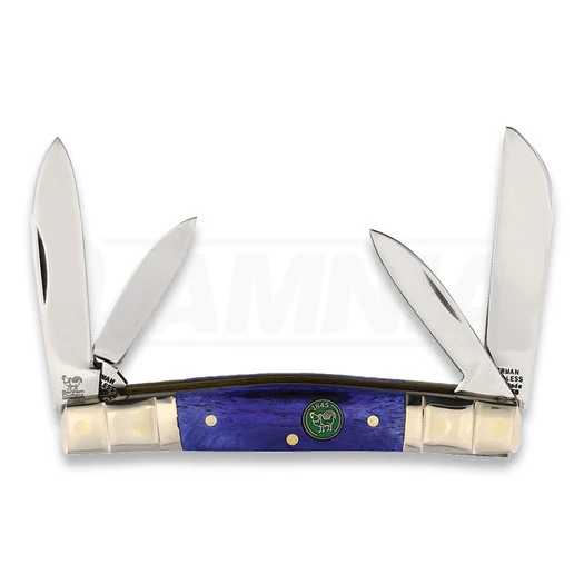 3.63″ (9.22cm) closed. Satin finish stainless twin pen, sheepsfoot, and spear blades. Purple smooth bone handle. Nickel silver bolster(s). Inlay shield.