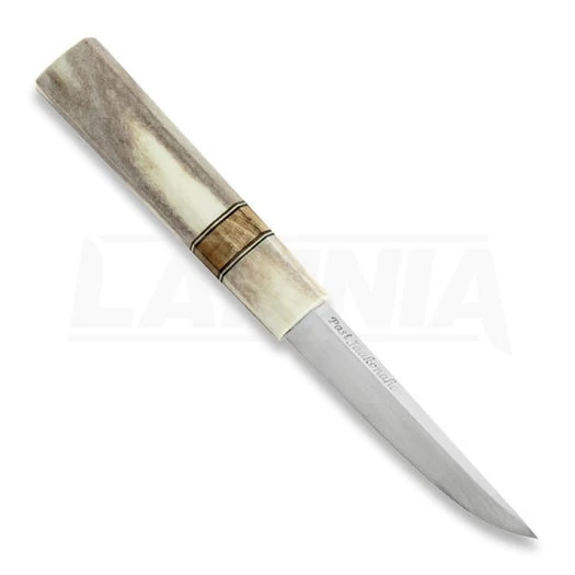 Kahva / Handle: poronsarvi, koivunpahka, uushopea, nahka / reindeer antler, birch burl, nickel silver, leather