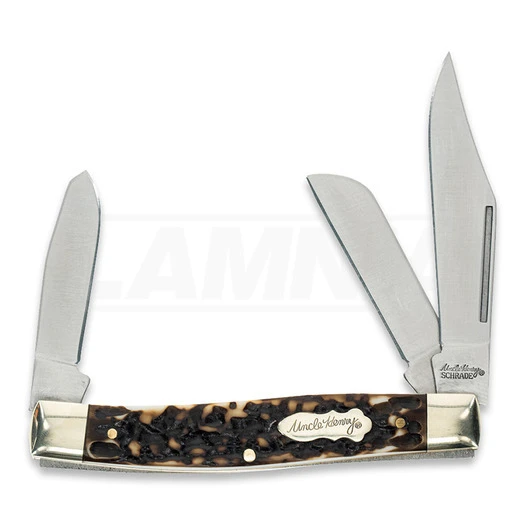 Uncle Henry. 4.25″ (10.8cm) closed. Satin finish stainless clip, sheepsfoot, and spey blades. Staglon handle. Nickel silver bolster(s). Inlay shield.