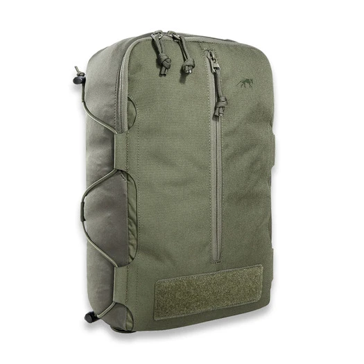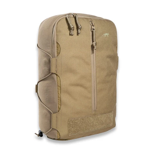 Accessory bag with a MOLLE reverse system. The inside features MOLLE hook-and-loop and a mesh pouch. The bag is hydration system compatible with the corresponding tube guide and the front pocket has a vertical zipper. The side panels are elastic. The entire system can be packed flat with bungee cords.