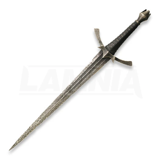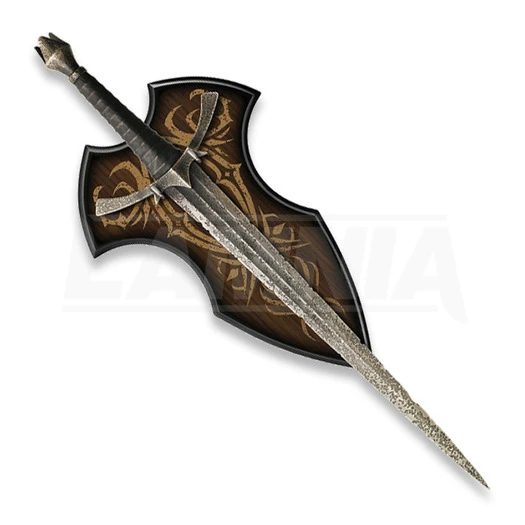 Lord Of the Rings Series. 638 mm overall. 445 mm distressed finish stainless blade. Black leather wrapped handle. Antique finish cast metal guard and pommel. Wooded wall display plaque. Certificate of Authenticity. Authentically detailed replica of the actual prop used in the motion picture, The Hobbit: An Unexpected Journey. Officially licensed.